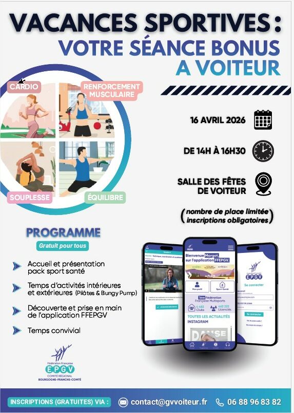 Comme indiqué sur le flyer ci-joint, le comité régional, le comité départemental Jura et l’Association Gym Volontaire de Voiteur proposent, le jeudi 16 avril, pendant les vacances de Pâques, une séance gratuite comportant 2 activités physiques, la présentation du Pack Sport Santé et la découverte de l’application FFEPGV.